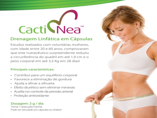 Trata-se de um produto que possui em sua composição propriedades antioxidantes e diuréticas e que é indicado para o controle do peso, a preservação das células do organismo contra a ação prejudicial dos radicais livres. Com isso, a promessa é que Cactinea promove a eliminação de fluídos do organismo sem que ocorra a perda de minerais, a diminuição do peso corporal e do armazenamento de gorduras e a redução das medidas do quadril, além de prometer afinar a cintura.