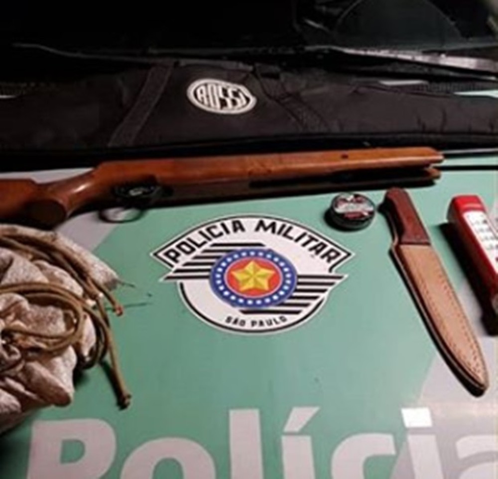 Os homens estavam com uma espingarda de pressão e alegaram praticar tiro esportivo. Mas os policiais encontraram com eles alimentos usados para caçar pacas e um local feito para observar o animal.