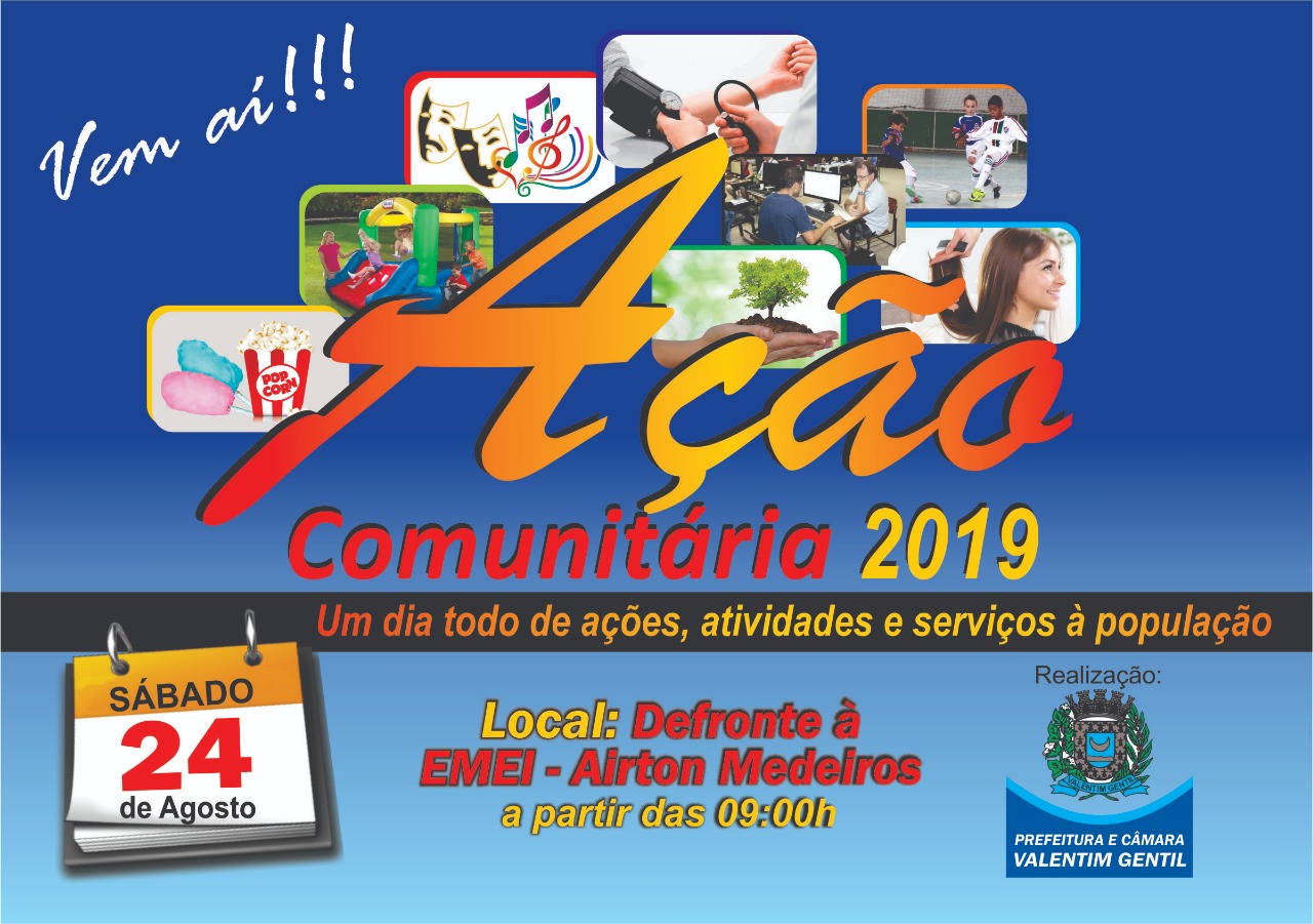 Como uma forma de aproximar a administração municipal e a comunidade, no dia 24 de agosto a partir das 9h, em frente a E.M.E.I. Airton de Medeiros, a Prefeitura de Valentim Gentil promoverá a 3ª edição da Ação Comunitária.
