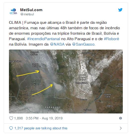 No Twitter, a empresa de meteorologia MetSul afirmou que as fumaças que atingem o País são resultados de focos de incêndio de enormes proporções que ocorrem na tríplice fronteira entre Brasil, Bolívia e Paraguai nas últimas 48 horas.
