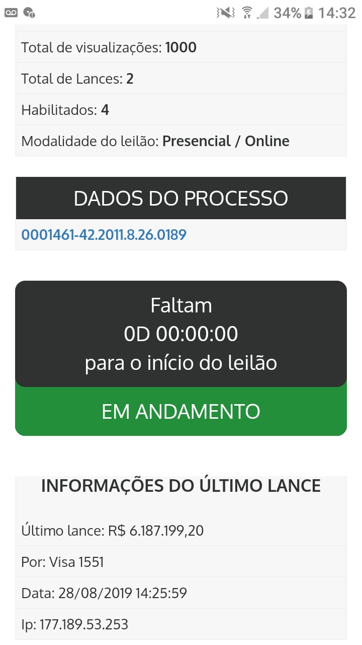 Print Screen do encerramento do leilão confirmando a proposta vencedora
