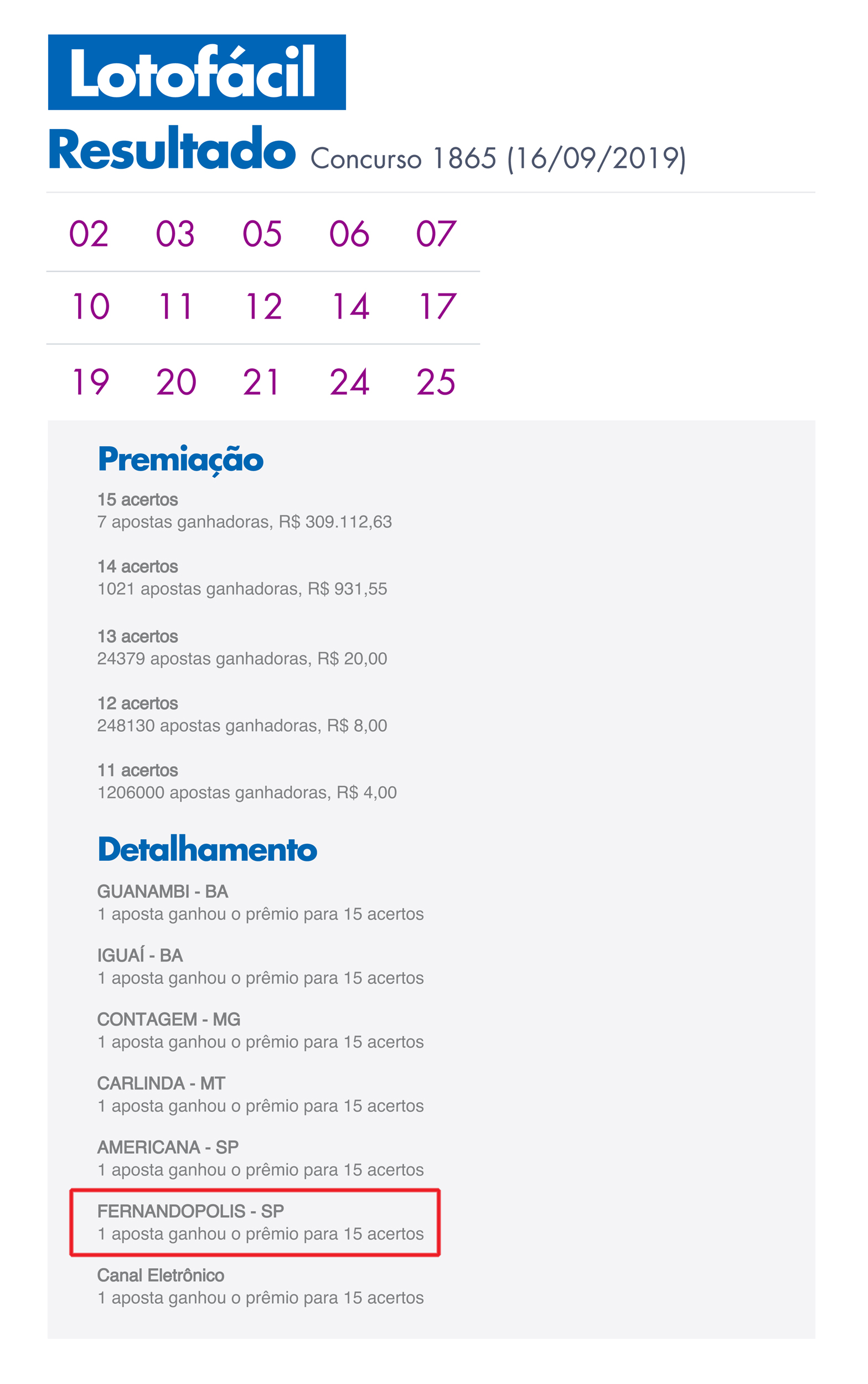 De acordo com a Caixa, duas apostas são do Estado de São Paulo (Americana e Fernandópolis), duas da Bahia (Guanambi e Iguaí), uma de Minas Gerais (Contagem), uma do Mato Grosso (Carlinda) e uma outra feita por canal eletrônico no site oficial das loterias. O morador de Fernandópolis ganhou R$ 309.112,63 ao acertar 15 números no sorteio.
