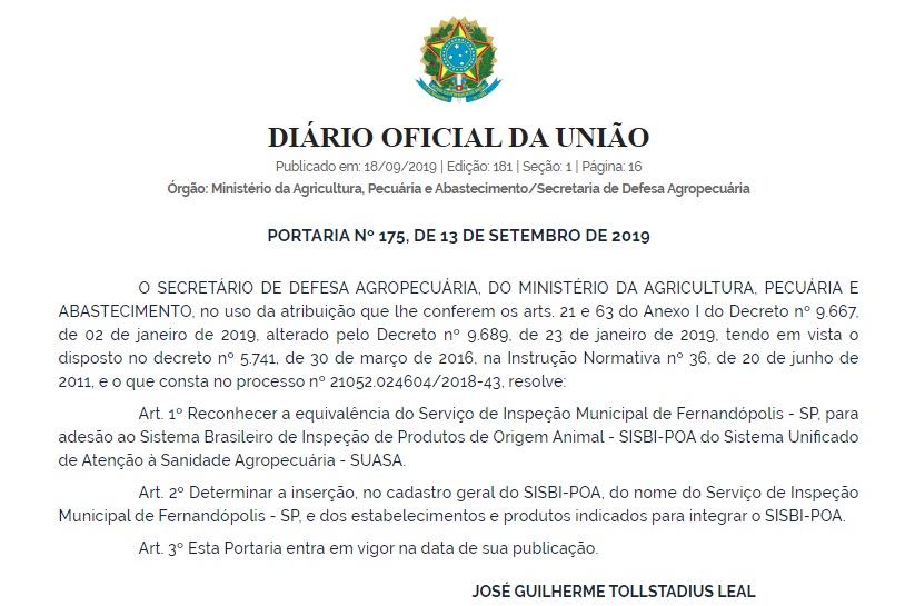 Fernandópolis foi reconhecida em publicação do último dia 18, no Diário Oficial da União, com a equivalência junto aos serviços de inspeção municipal de produtos do Sistema Brasileiro de Inspeção de Produtos de Origem Animal (SISBI-POA), do Ministério da Agricultura, Pecuária e Abastecimento (MAPA).