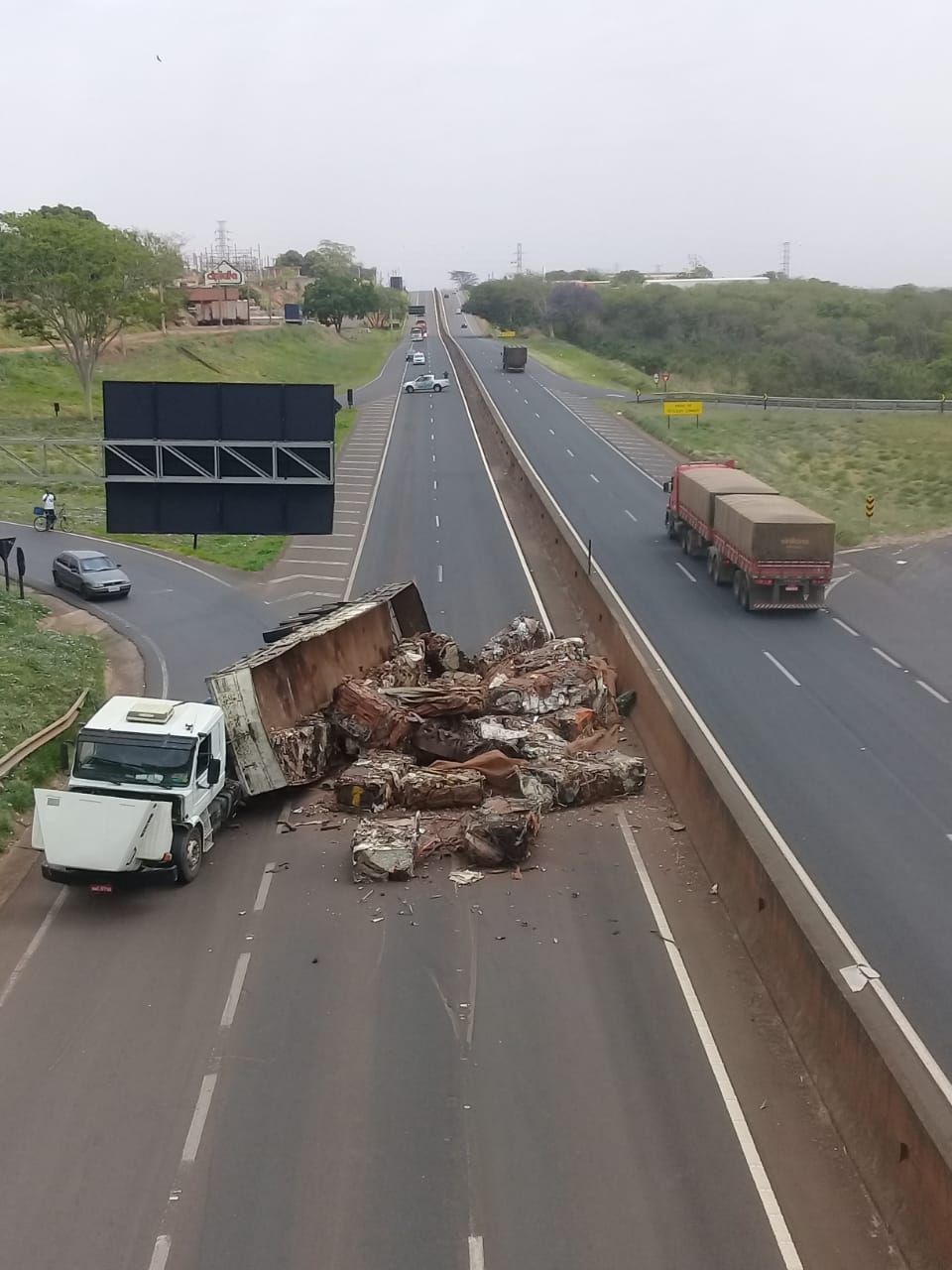 No final da manhã desta terça-feira, dia 24, a carroceria de uma carreta carregada com sucata tombou quando saia da rampa de acesso para a Rodovia Euclides da Cunha (SP-320), em Fernandópolis.