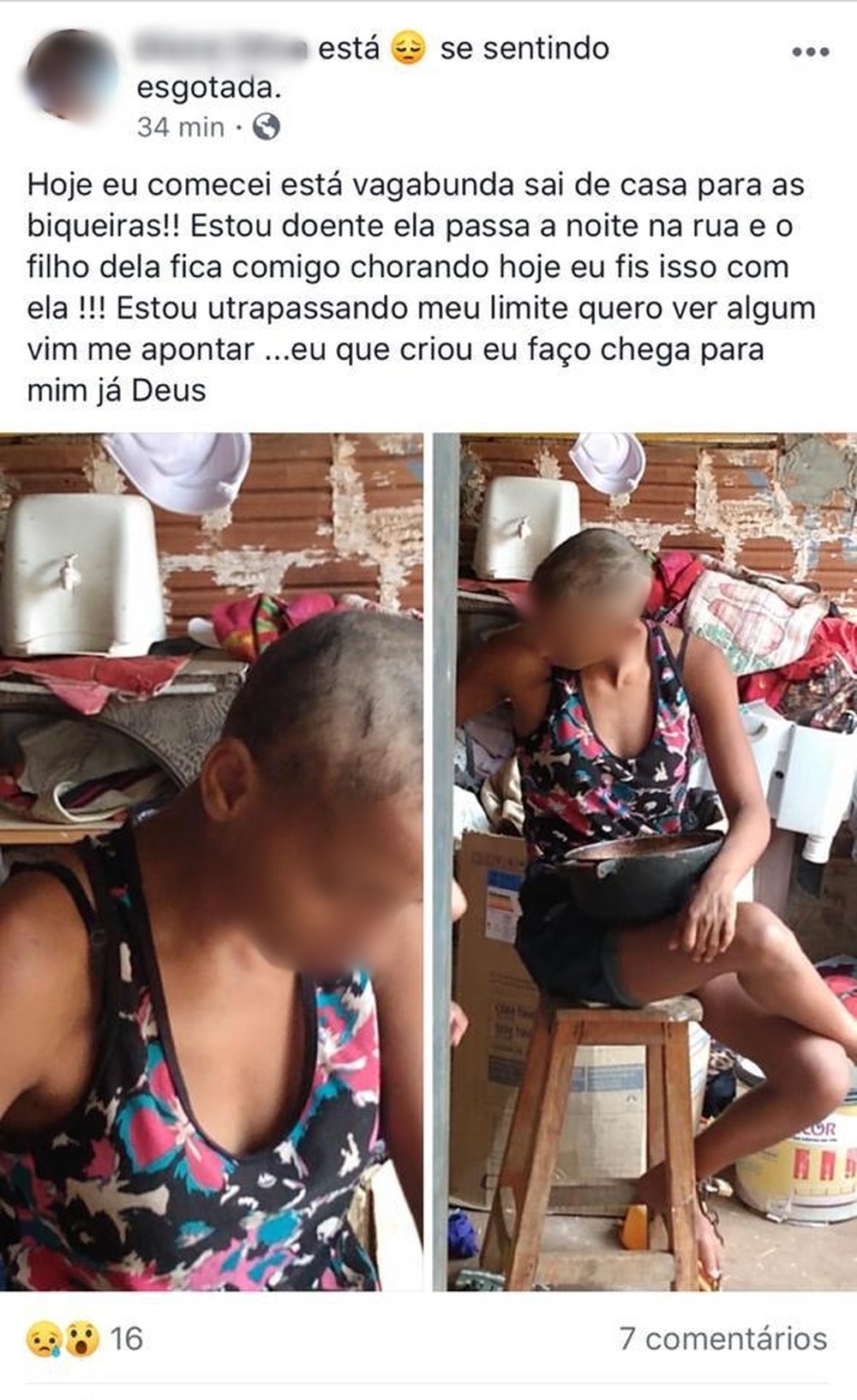 “Hoje eu comecei. Esta vagabunda sai de casa para as biqueiras. Estou doente, ela passa a noite na rua e o filho dela fica comigo chorando. Hoje eu fiz isso com ela!! Estou ultrapassando meu limite. Quero ver algum me apontar. Eu que criei, eu que faço. Chega pra mim já Deus”, escreveu a mãe no mesmo post.