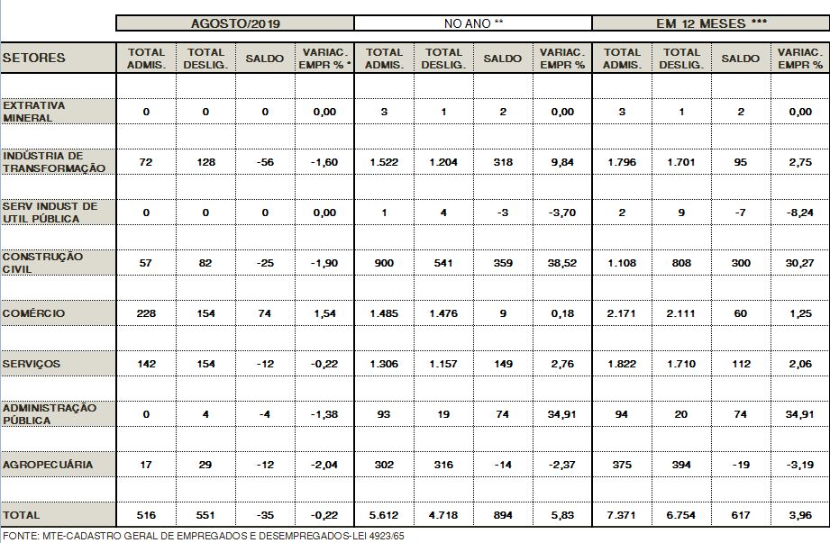 O Caged (Cadastro Geral de Empregados e Desempregados), da Secretaria do Trabalho do Ministério da Economia, divulgou, recentemente, que Fernandópolis fechou 35 vagas com carteira assinada em agosto, sendo o quinto mês seguido com desempenho negativo em 2019. O resultado é o saldo, ou seja, a diferença entre contratações e demissões.