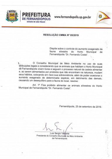 O Conselho Municipal de Meio Ambiente aprovou a Resolução 05/2019, que dispõe sobre o crescimento exagerado da fauna silvestre do Horto Municipal Florestal de Fernandópolis "Dr. Fernando Costa". De acordo com o documento, fica proibido alimentar os animais que habitam o horto.
