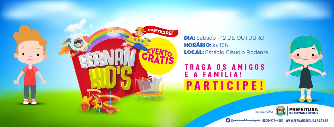 A Prefeitura de Fernandópolis realiza no sábado, 12 de outubro, mais uma edição do tradicional “FernanKids”, festa para comemorar o dia das crianças. As atrações acontecem a partir das 16h, no estádio municipal “Cláudio Rodante”, com entrada gratuita.
