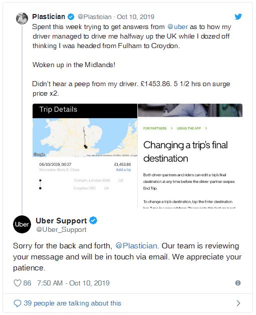 "Passei esta semana tentando obter respostas da Uber sobre como meu motorista conseguiu cruzar metade do Reino Unido enquanto eu cochilava pensando que estava indo de Fulham para Croydon", contou o passageiro.
