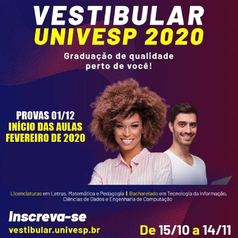 A Universidade Virtual do Estado de São Paulo (Univesp) abre nesta terça-feira, dia 15, as inscrições para mais de 16 mil vagas do vestibular anual 2020, destinadas a mais de 300 municípios, o maior processo seletivo em extensão territorial e número de vagas gratuitas do ensino superior paulista. Serão oferecidos seis cursos, com duas áreas básicas de ingresso, via vestibular. As Licenciaturas em Letras, Matemática e Pedagogia e os voltados ao eixo de Computação: Bacharelado em Tecnologia da Informação (BTI), Bacharelado em Ciência de Dados e Engenharia de Computação. As inscrições terminam no dia 14 de novembro, às 15h, e devem ser feitas pelo site vestibular.univesp.br. As provas ocorrerão no dia 1 de dezembro. O início das aulas está previsto para fevereiro.