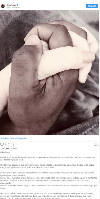 Em um techo, eles explicam o motivo do fim da união: "O motivo da decisão é que percebemos que nossa relação se transformou numa linda amizade. No nosso caso, foi um processo natural, com muita maturidade e amor".
