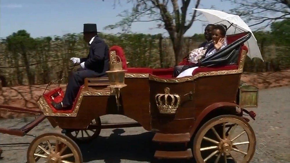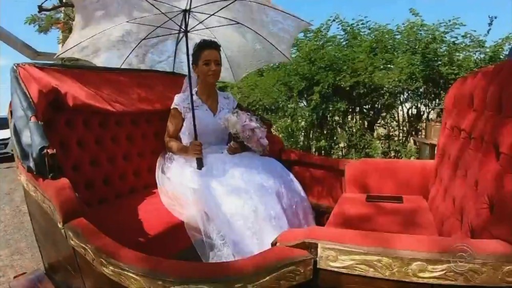 “Fiquei muito emocionada, muito feliz de ver o sonho realizado, um casamento de princesa”, diz Gessilda, após chegar na carruagem feita pelo próprio noivo.