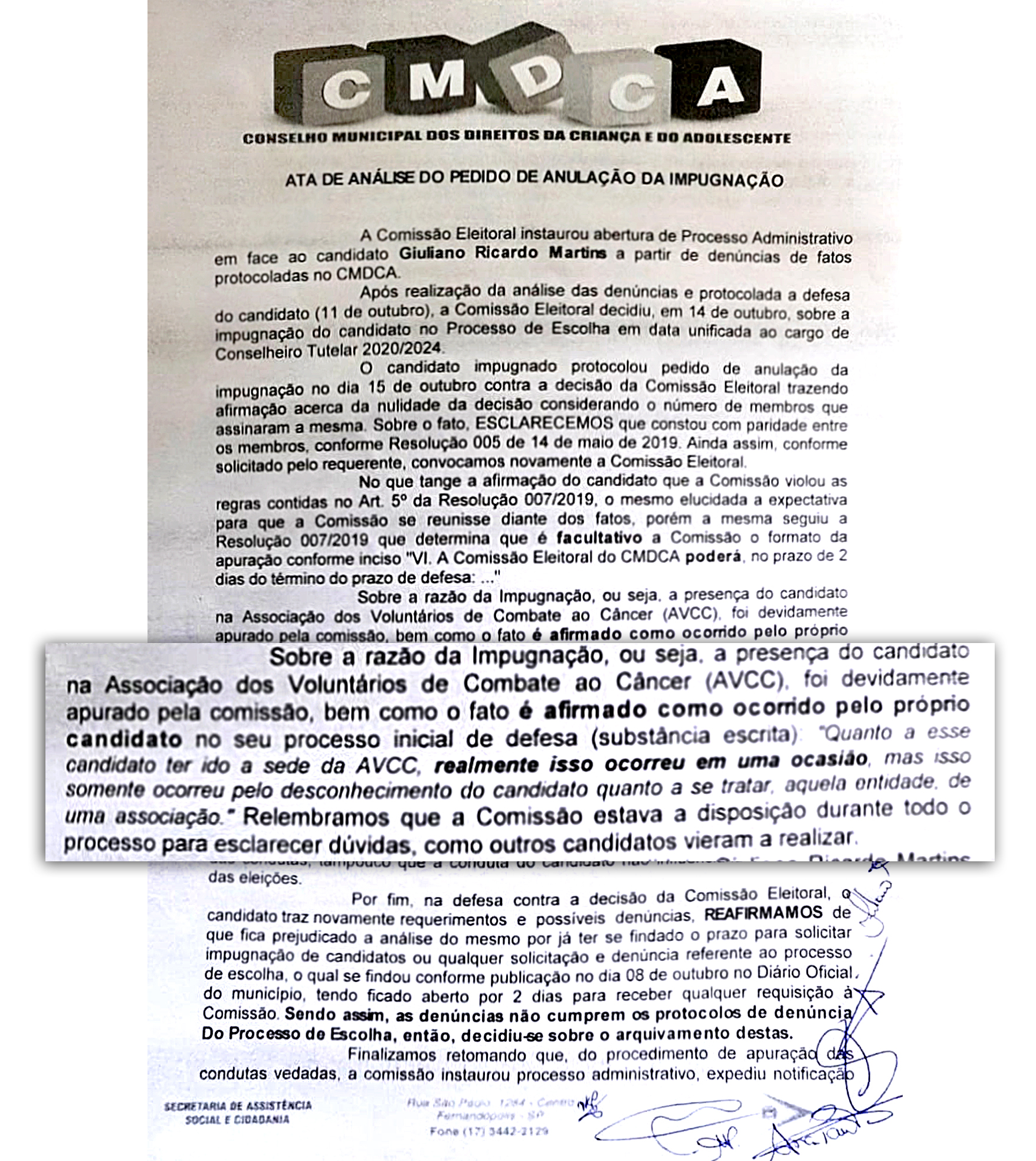 De acordo com a ata de análise do pedido de anulação da impugnação, a Comissão Eleitoral explicou que a impugnação se deu porque Giuliano Ricardo esteve na Associação dos Voluntários de Combate ao Câncer (AVCC) para fazer campanha visando as eleições para o Conselho Tutelar. No lugar dele, o Conselho Municipal da Criança e Adolescente convocou o sexto colocado na classificação geral, Agenor Manoel da Silva.