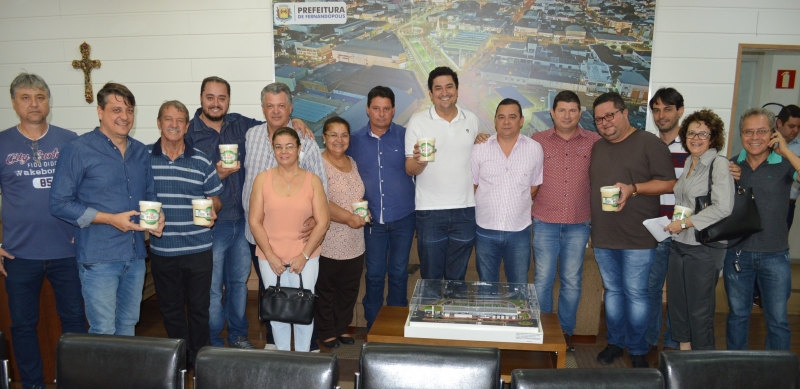 Membros do Executivo, do Legislativo e empresários no anúncio da instalação da “Delícias do Porco” em Setembro. Foto: Assessoria Imprensa PM Fernandópolis