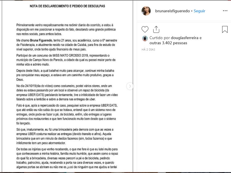 A miss de Campo Novo do Parecis (MT) de 2019 perdeu o título depois de se envolver em uma polêmica ao publicar vídeos debochando de um entregador por aplicativo que estava de bicicleta, em Cuiabá.