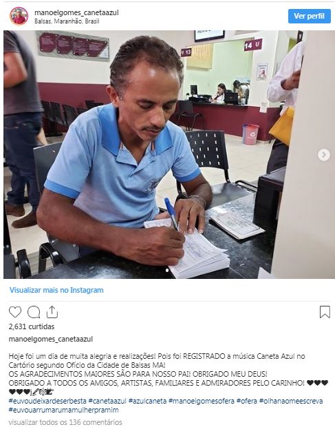 "Eu ia para o colégio e perdi a caneta azul. Lá no colégio eu perdia uma, perdia outra, aí ninguém me deu a caneta que tava meu registro nela. Eu não achei e, no outro dia, fiz a música", disse Manoel à TV Mirante, afiliada da TV Globo.