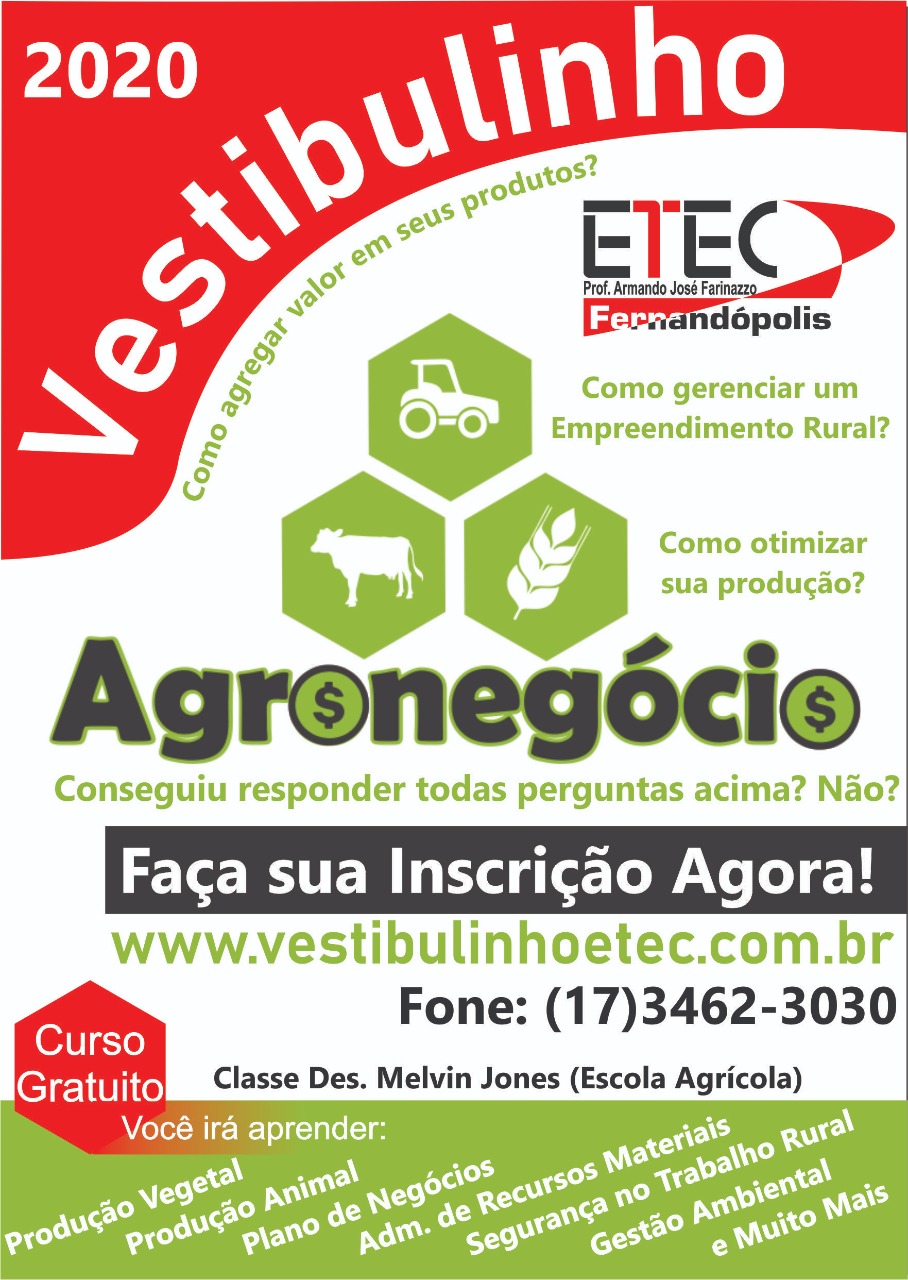 A ETEC – Escola Técnica – Prof. Armando J. Farinazzo em parceria com a Prefeitura de Fernandópolis lança para 2.020 o Vestibulinho do Agronegócio. O curso é gratuito e será realizado nas dependências da Escola Agrícola Melvin Jones, dedicado exclusivamente para as aplicações práticas.