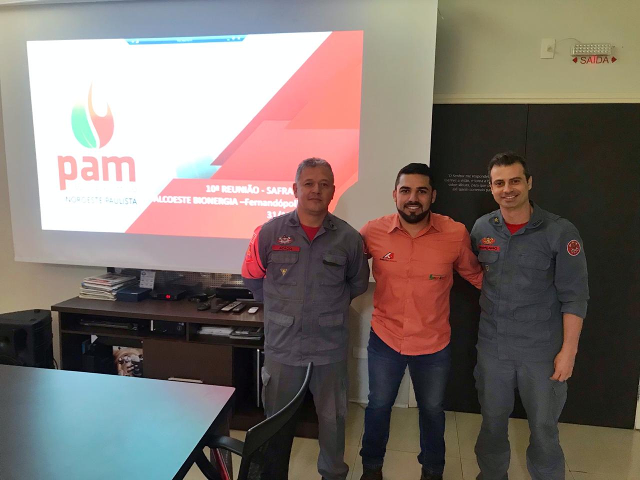 Nesta quinta-feira, dia 31, na sede da Alcoeste Bioenergia Fernandópolis - Grupo Arakaki, o capitão Fernando Mançano e o sargento Gilson Acácio dos Santos, do Corpo de Bombeiros, participaram de uma reunião com membros do PAM (Plano de Auxílio Mútuo).