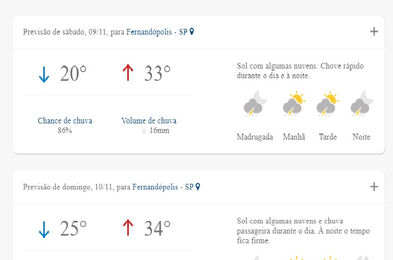Segundo a previsão do instituto Climatempo, amanhã pode chover até 10 mm, mais provavelmente nos períodos da tarde e da noite. Na quarta-feira, 06, o volume se intensifica podendo chegar aos 20 mm com possibilidade de chuva à qualquer horário.