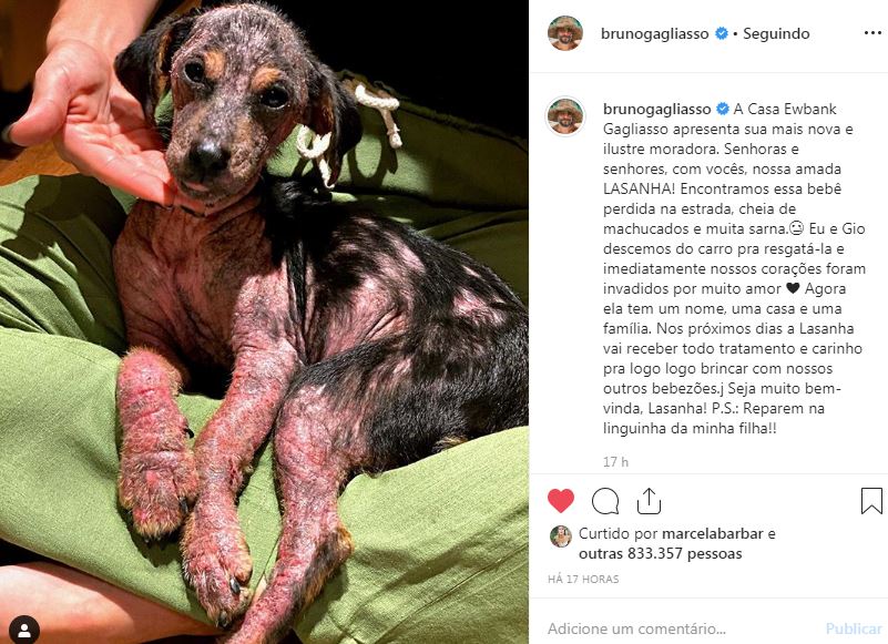 Em sua rede social Bruno relembra o resgate. "Descemos do carro para resgatá-la e imediatamente nossos corações foram invadidos por muito amor. Agora ela tem um nome, uma casa e uma família". A família apelidou a cadela de Lasanha.