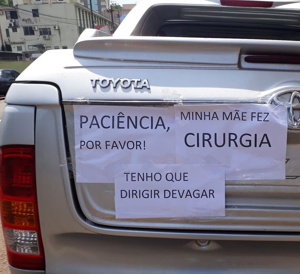Com três cartazes colocados na traseira da caminhonete, filha fez o apelo: “Paciência, por favor! Minha mãe fez cirurgia. Tenho que dirigir devagar”.