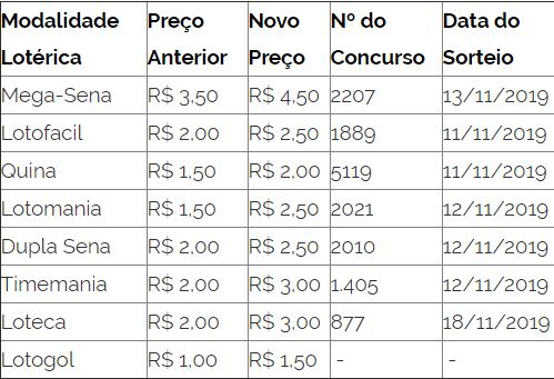Os novos valores foram autorizados pela Portaria nº 8.061 do Ministério da Economia, publicada no Diário Oficial da União no último dia 31 de outubro. O reajuste valerá para os sorteios que serão realizados a partir de segunda-feira, 11. Os novos preços serão os mesmos em todos os canais de apostas, conforme tabela: