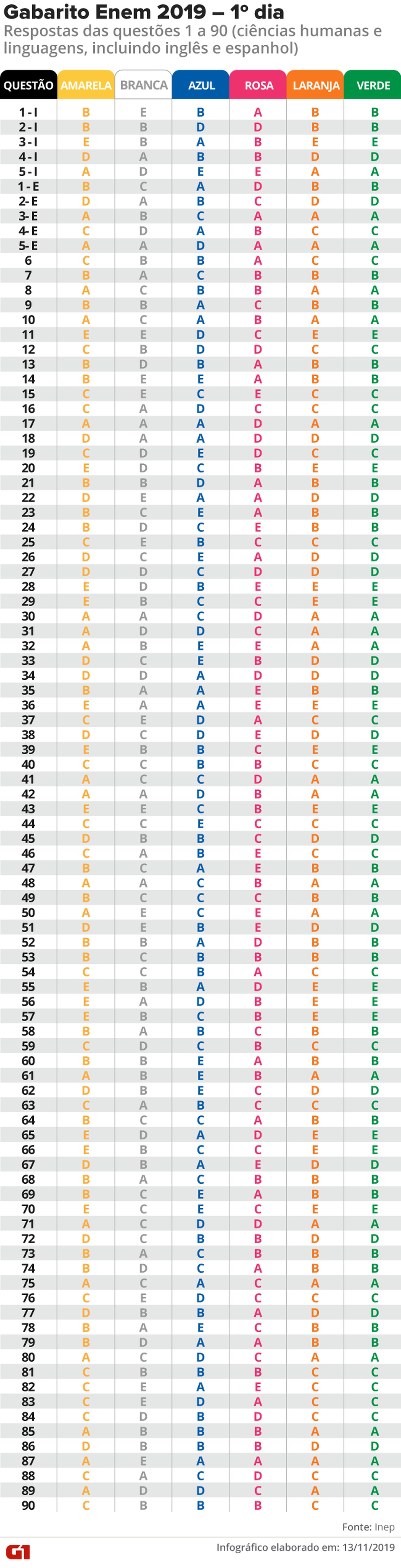 Gabarito Enem 2019 - 1º dia (provas de linguagens e ciências humanas)
