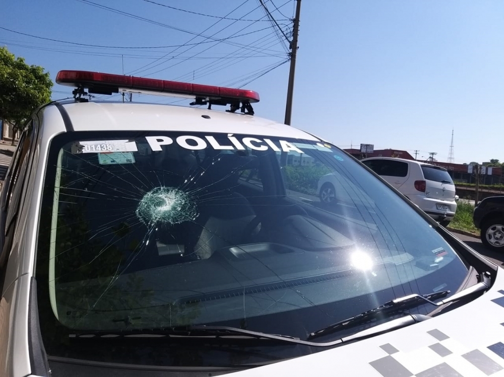 Parabrisa da viatura da Polícia Militar foi danificada durante atendimento da ocorrência