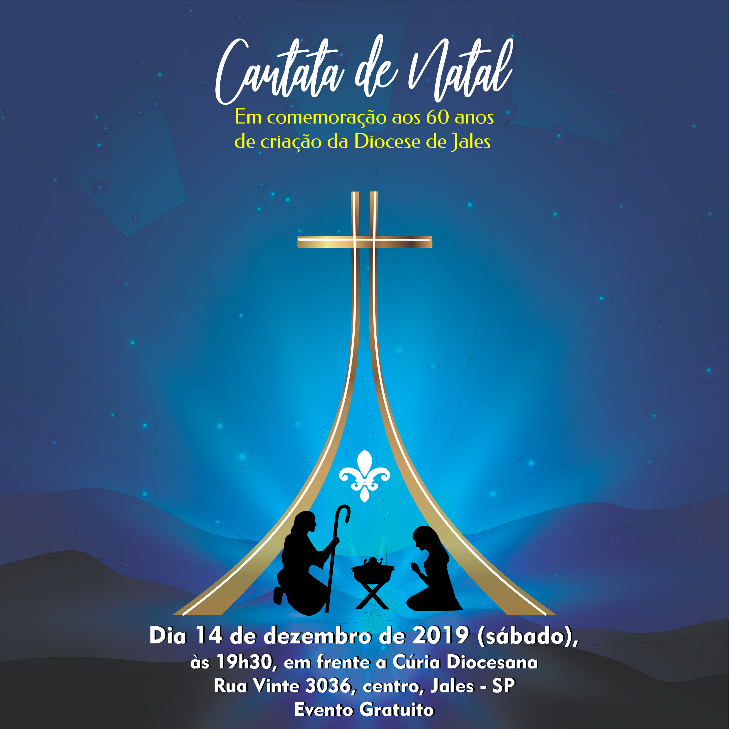 No dia 14 de dezembro, às 19h30, a Diocese de Jales, em comemoração aos 60 anos de sua criação, realizará a Cantata de Natal. O evento será realizado em frente a Cúria Diocesana e do Museu Diocesano, localizados na rua Vinte, 3036, no centro em Jales, próximo a Escola Dom Artur Horsthuis.