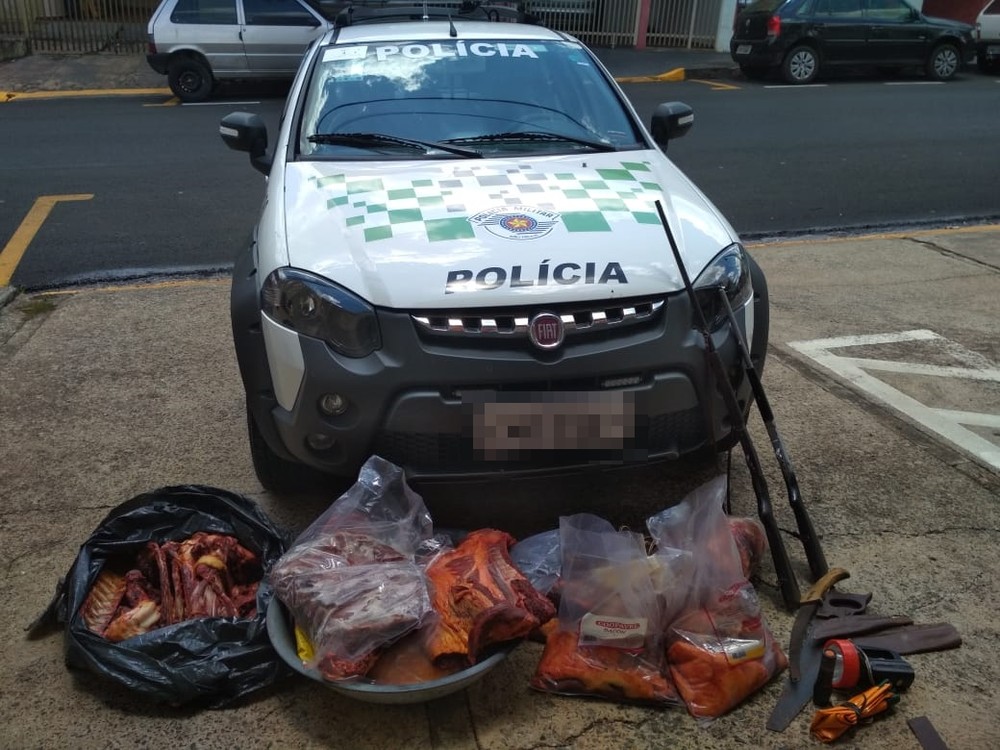 A polícia foi até o local e apreendeu 86 quilos de carne de anta, duas espingardas, uma arma calibre 22 e outra 36, além de munições.