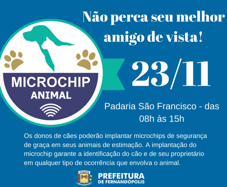 A microchipagem gratuita de cães em Fernandópolis é um projeto desenvolvido Prefeitura de Fernandópolis, por meio da Secretaria Municipal de Saúde e Centro de Controle de Zoonoses, e acontece em diferentes bairros da cidade até o final de 2019.