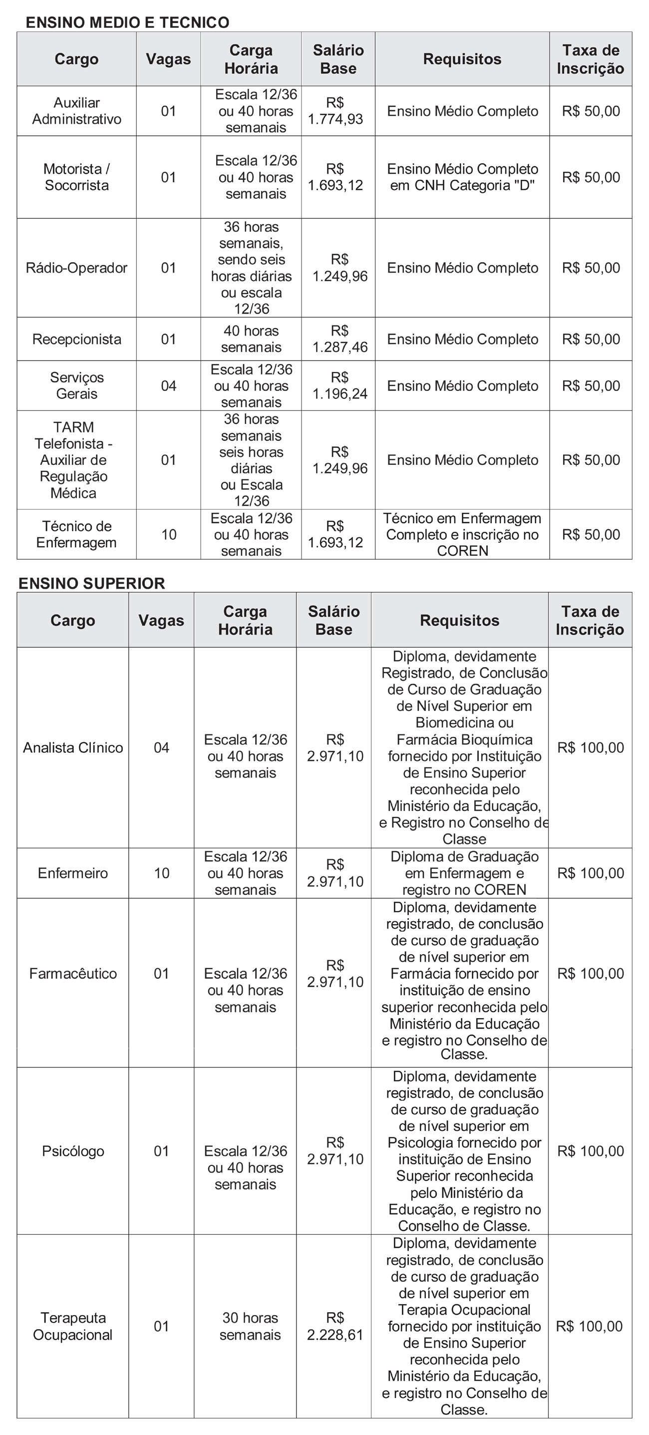 O período das inscrições será entre os dias 6 e 19 de dezembro. Confira os cargos oferecidos: Analista Clínico; Auxiliar Administrativo; Enfermeiro; Farmacêutico; Motorista/Socorrista; Psicólogo; Rádio-Operador; Recepcionista; Serviços Gerais; TARM Telefonista - Auxiliar de Regulação Médica; Técnico de Enfermagem e Terapeuta Ocupacional.