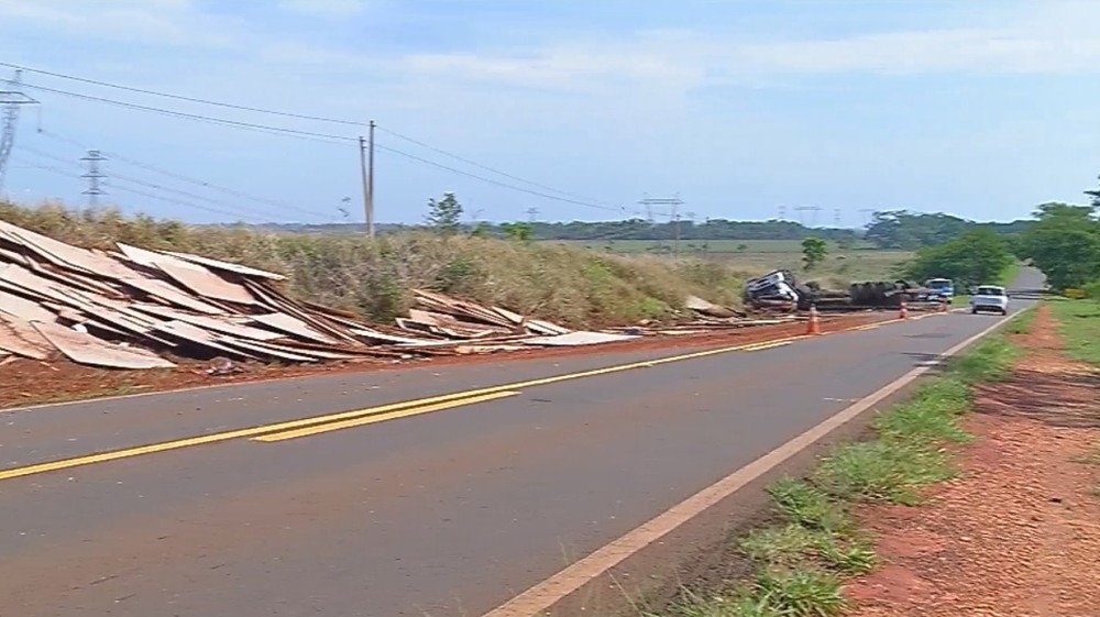 Uma carreta carregada com placas de madeira prensada capotou na Rodovia Gerson Dourado de Oliveira, no trecho de Itapura, nesta quinta-feira, 21. O veículo pesado ficou com as rodas para cima.