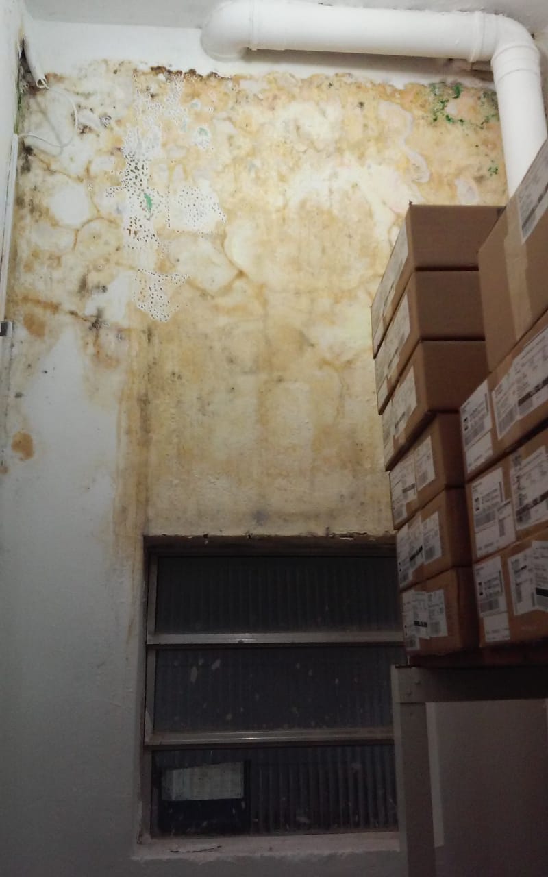 Prefeitura de Pereiras. Centro de Saúde. Infiltração e bolor no almoxarifado de armazenamento de medicamentos