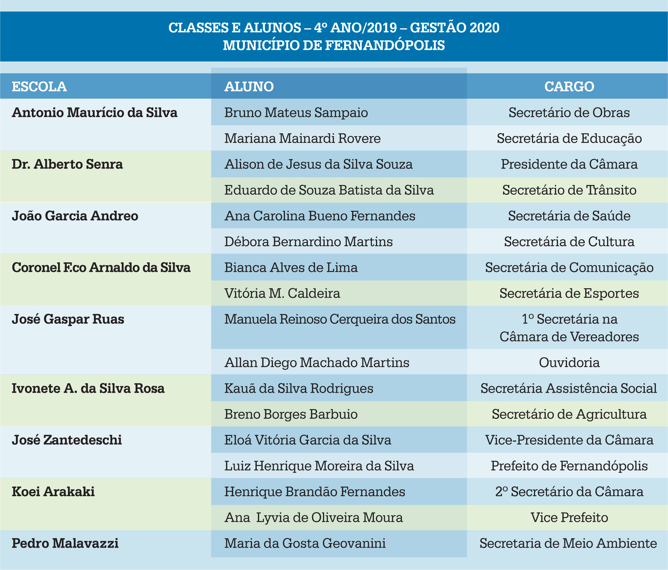 Como forma de incentivo aos alunos, a Prefeitura de Fernandópolis e Defesa Civil realizam pelo terceiro ano consecutivo o Programa ‘Prefeito e Agentes Mirins’. O concurso conta com a participação dos alunos do 4º ano das escolas da Rede Municipal de Ensino. Eles produziram redações na qual precisavam responder a pergunta sobre o que fariam caso fossem escolhidos prefeito, vice-prefeito, membro da câmara de vereadores ou secretário municipal. Cada aluno escolheu a função que gostaria de ocupar, inclusive definindo qual a secretária específica, para poder justificar sua resposta.
