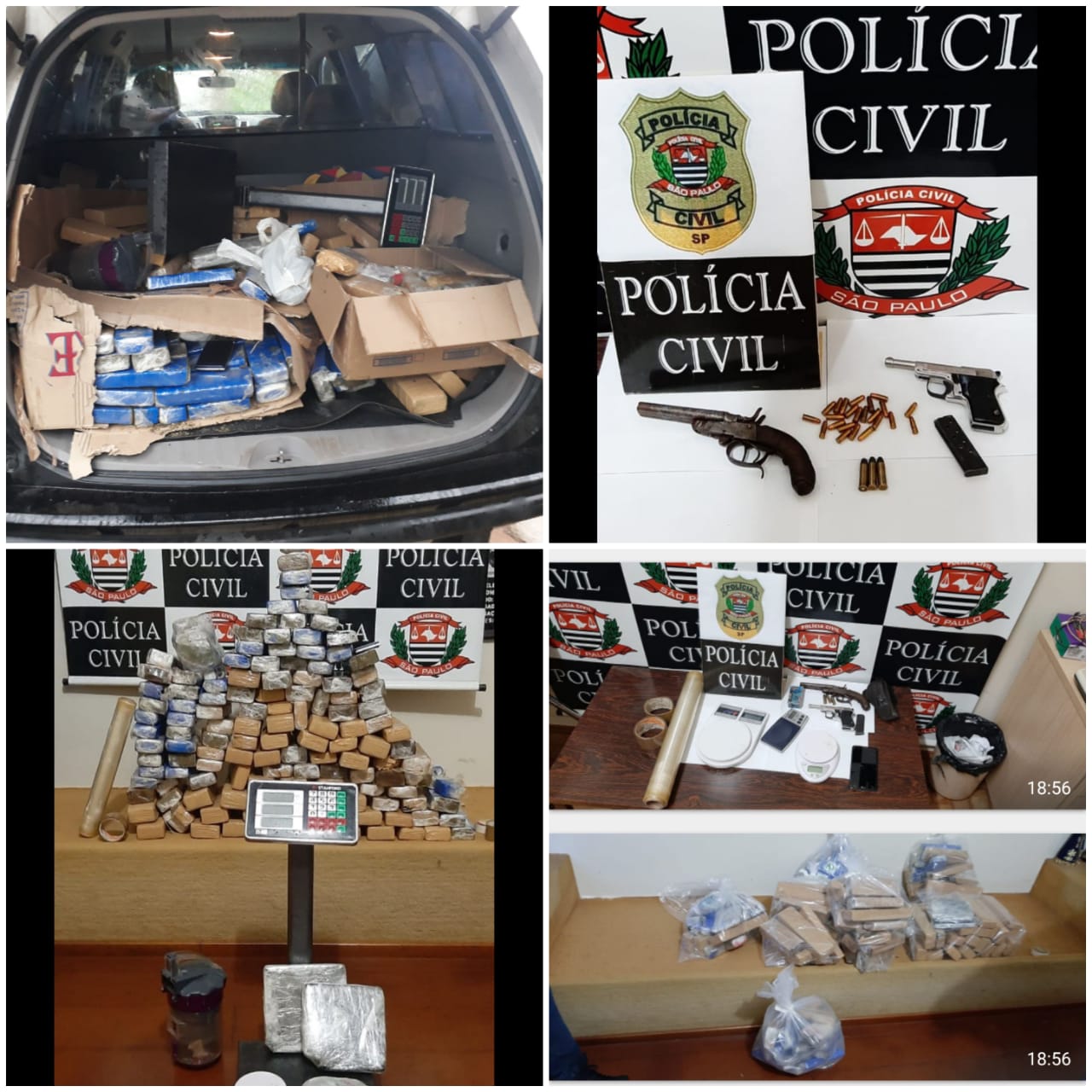 Em seguida, os agentes foram até a casa dos “fornecedores” da droga, na Rua Paschoalino Pedrazoli, no mesmo bairro e lá, em buscas pela residência, encontraram aproximadamente, 100kg de maconha, divididos em dezenas de tabletes prensados. Foram apreendidos ainda, 2kg de haxixe, uma pistola calibre 635, uma garrucha calibre 38 – municiada, dois carros e uma moto Honda/Biz, além de três balanças e celulares.