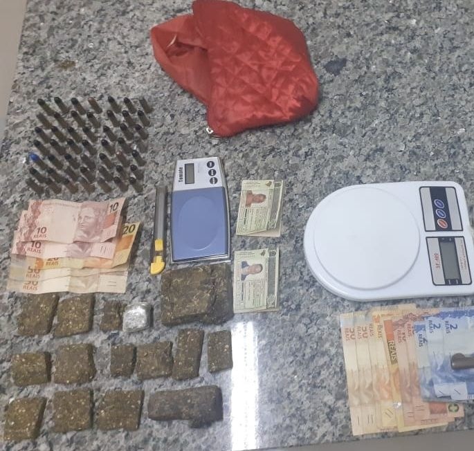 Com isso, os policiais solicitaram apoio, indo para a casa de um dos suspeitos. No local, foram encontrados 390 gramas de maconha, balança, estilete, 49 munições calibre 38 e 140 reais.