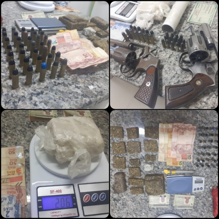 Já na residência do outro suspeito, encontraram duas armas calibre 38, 13 munições do mesmo calibre, além de 14 munições calibre 32, uma balança, 206 gramas de cocaína e 216 reais.