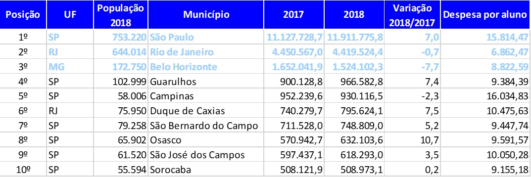 Já as maiores despesas por aluno foram verificadas em Santos (SP), de R$ 17.120,60; Niterói (RJ), de R$ 16.267,94; Campinas (SP), de R$ 16.034,83; São Paulo (SP), com R$ 15.814,47; e Jundiaí (SP), de R$ 13.276,68.