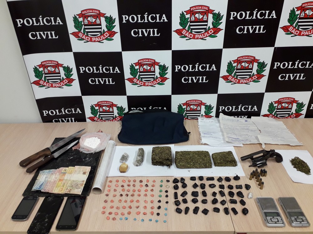 Crack, cocaína e maconha, dinheiro, balanças e um revólver calibre 39 municiado foram apreendidos pela Polícia Civil. Suspeitos foram levados para a delegacia e estão à disposição de Justiça
