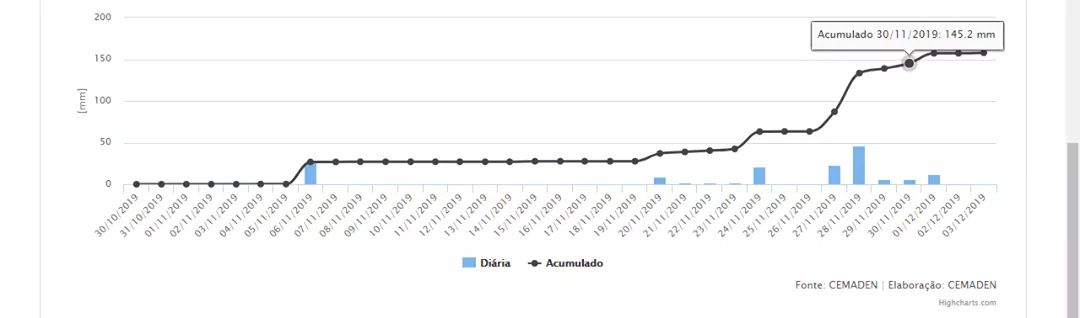 A chuva de maior volume deste ano em novembro foi registrado no dia 28 quando caiu 102 mm em um só dia, onde apenas em uma hora caiu 45 mm.