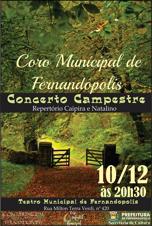 O Coro Municipal de Fernandópolis se apresenta na próxima terça-feira, 10, no 1ª Concerto Campestre. O encontro programado pelo maestro Sandro Muniz no Teatro Municipal de Fernandópolis, apresentará um repertório composto por canções caipiras e regionais arranjadas para coro polifônico a 4 vozes e músicas natalinas dado a proximidade do Natal. O concerto também contará com a participação do Coro Infantil Municipal. A apresentação faz parte da programação do FerNatal 2019.