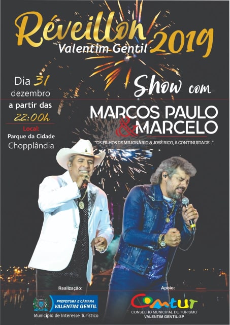 O ano de 2020 vai começar com muita animação em Valentim Gentil. A prefeitura promoverá no dia 31 de dezembro, show com Marcos Paulo e Marcelo para comemorar a chegada do novo ano. O evento gratuito e aberto a comunidade terá inicio às 22h e será realizado no Parque da Cidade – a Chopplândia.