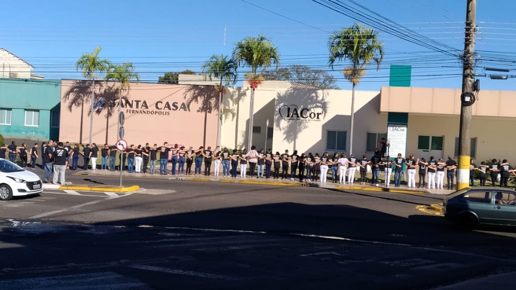 Funcionários abraçando o prédio da Santa Casa de Fernandópolis esperançosos no salvamento da Instituição