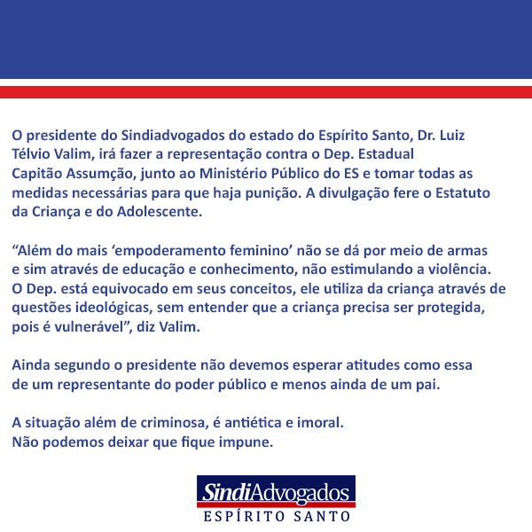 A publicação viralizou nas redes sociais e causou reações contrárias ao deputado. O presidente do Sindicato de Advogados do Espírito Santo (Sindiadvogados), Luiz Telvio Valim, emitiu nota de repúdio e disse que representará contra o deputado junto ao Ministério Público Estadual e tomar todas as medidas necessárias para que haja punição. Veja a nota na íntegra: