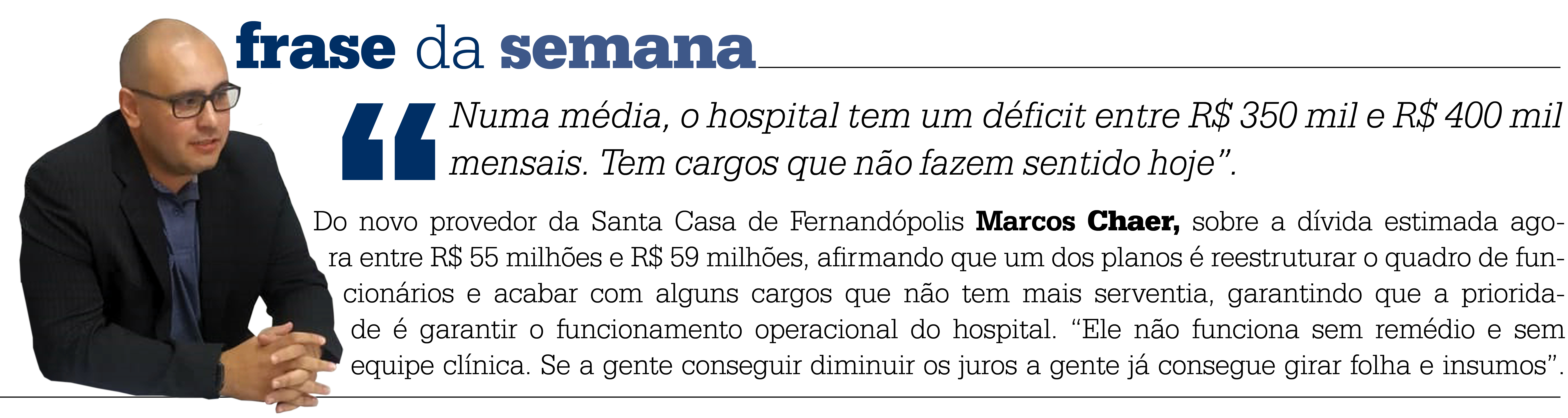Quanto a Santa Casa local (ou a cidade de Fernandópolis) perderia com a derrocada da entidade e consequente fechamento das portas? Eis a dúvida que há tempos atormentam alguns precavidos e que mais recentemente, com o ápice da crise, passou a perturbar maior número de lideranças. E o temor é tão grande e relevante que alternativas já foram exaustivamente estudadas (e elas limitam-se à intervenção judicial ou estadual). Obviamente que os principais prejudicados seriam os pacientes, sobretudo aqueles atendidos através do SUS e que teriam que migrar para outras unidades congêneres em busca do tratamento. Para esses, quantificar financeiramente o prejuízo beira a ofensa, mas para a entidade não; ao contrário, é racional e obrigatório. Pois aos números. Somente com operações do SUS (Teto Mac e TRS), englobando atendimento aos pacientes e Hemodiálise, será de R$ 21,6 milhões ano. Valor expressivo e que mantê-lo por aqui é o primeiro dos desafios que recai sobre o novo provedor Marcos Chaer.
