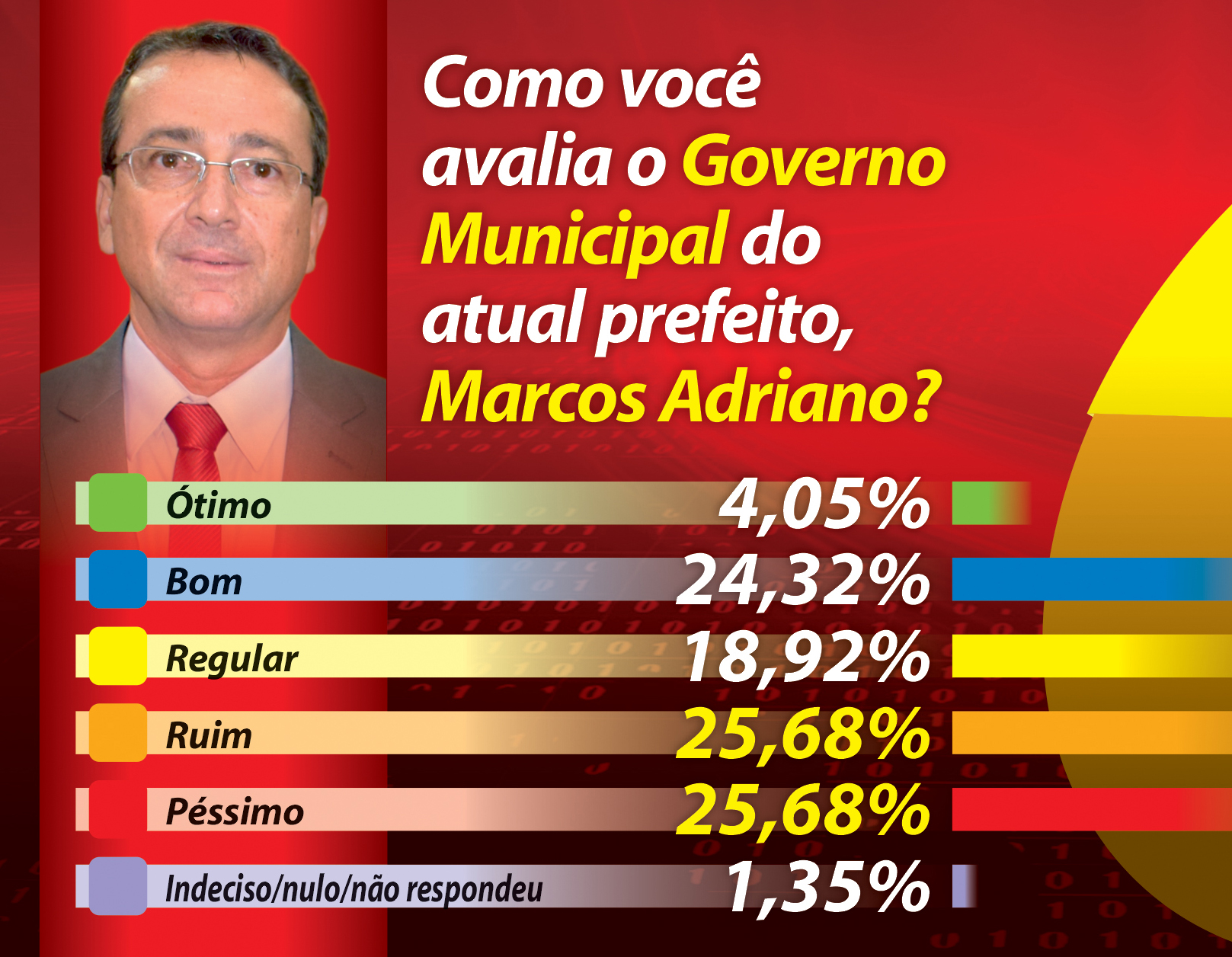 Pelos dados coletados no último dia 01 de dezembro, os eleitores de Pedranópolis (sede) e dos distritos de Santa Isabel e Dulcelina continuam reprovando a atual condução do Executivo Municipal pelo prefeito Marcos Adriano da Silva-PTB. Aprovam a sua administração 28% dos entrevistados que a qualificaram como “ótima” ou “boa”. Por outro lado, expressivos 51% rejeitaram-na, adjetivando-a como “ruim” ou “péssima”. O índice de reprovação é praticamente 1,8 vezes maior que o de aprovação. No intermédio estão 18% que afirmaram ser “regular”.
