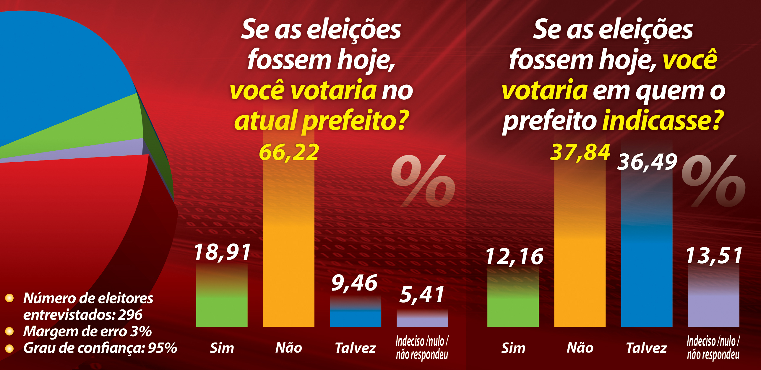 Disparados, 66% dos eleitores afirmaram que “não votariam” no atual prefeito em eventual recondução ao cargo. Na pesquisa anterior esse número era de 60%. Outros 18% declaram que “sim”, mesmo índice de Abril e outros 9% que “talvez” (em Abril era 11%).