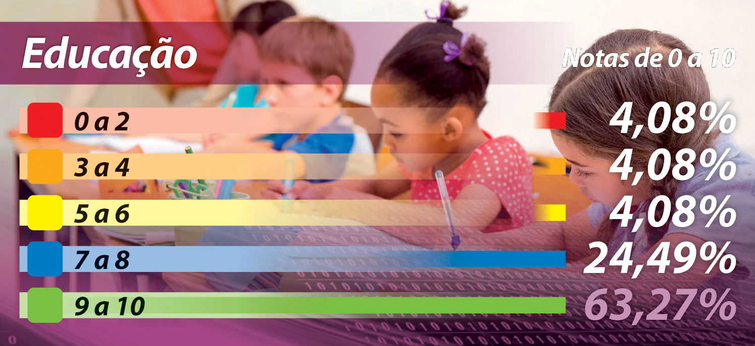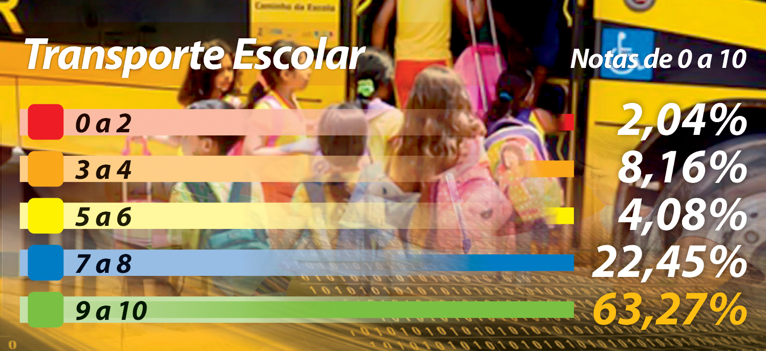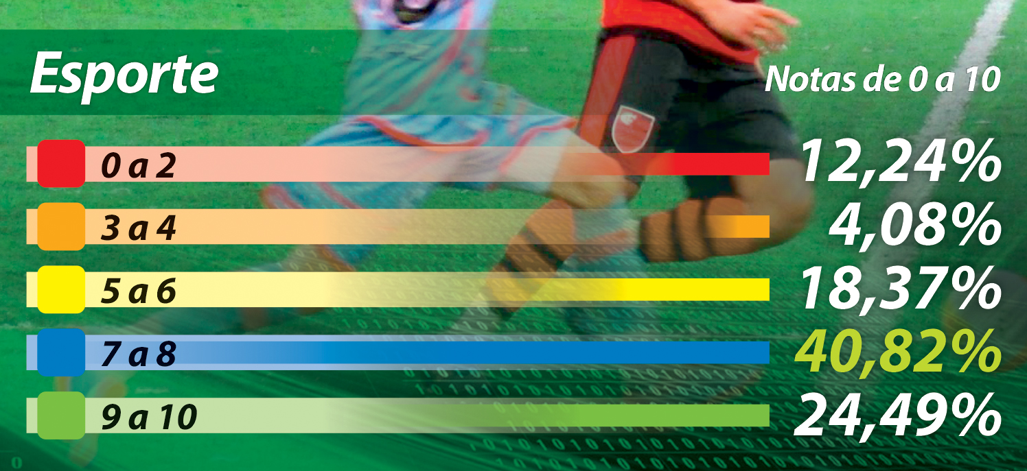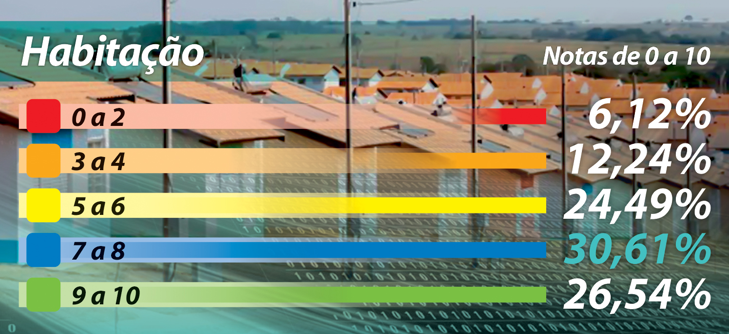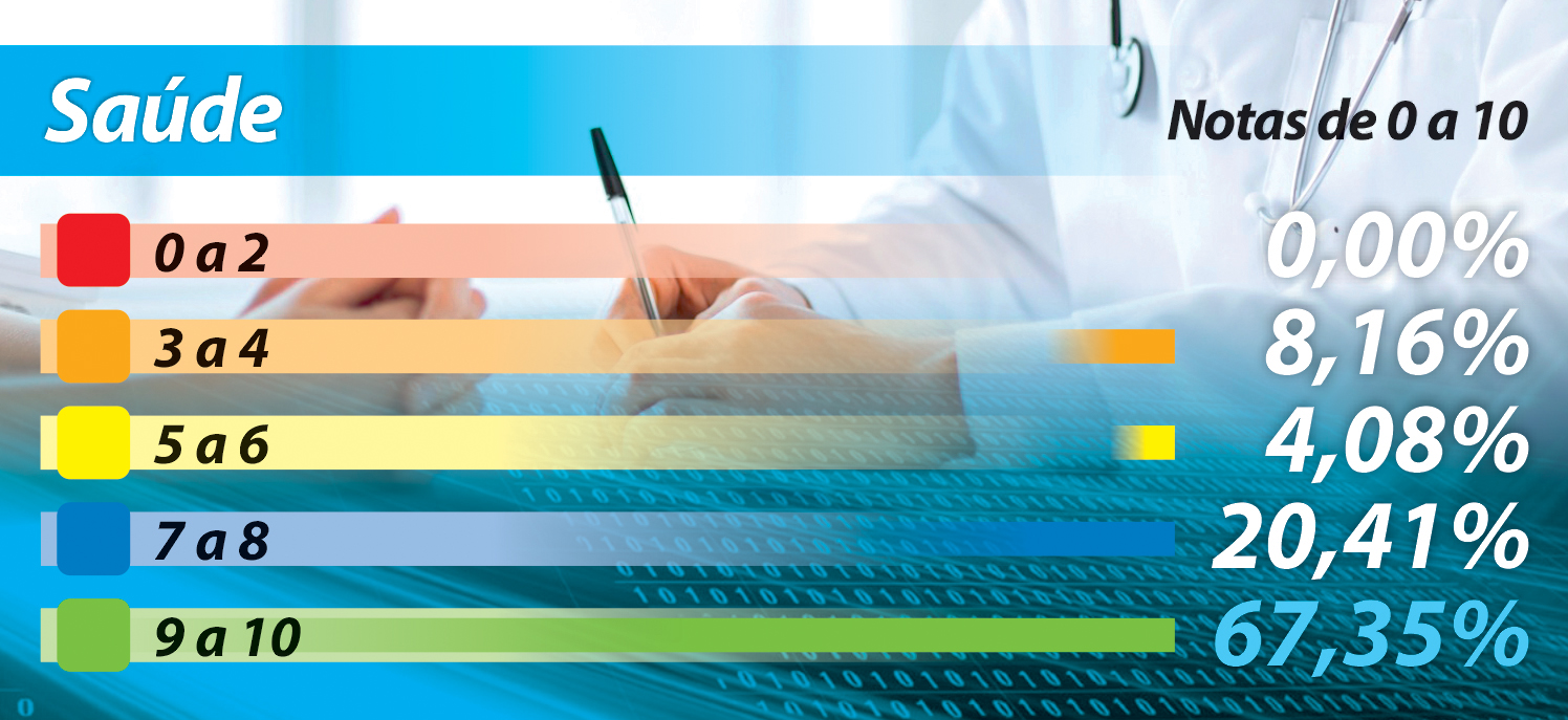 O mais bem avaliado, disparado, foi o da “Saúde Pública. Ele obteve notas nove ou dez para 67% dos entrevistados. O pior índice desse setor foi notas 3 a 4, demonstrando, daí, ampla aprovação. No outro extremo está o “Esportes” com apenas 24% de notas nove e dez, seguido de “Habitação” com 26% de notas máximas. Outros destaques positivos estão naqueles setores considerados essenciais pela população: “Educação” e “Transporte Escolar”. Em ambos as notas nove ou dez totalizaram 63%. Confira, nos gráficos abaixo todos os detalhes.