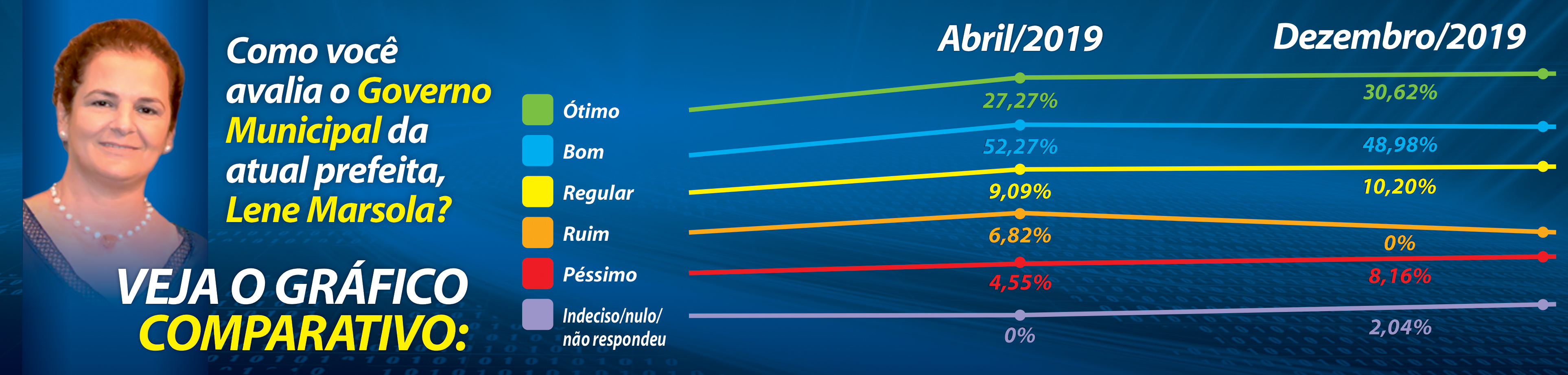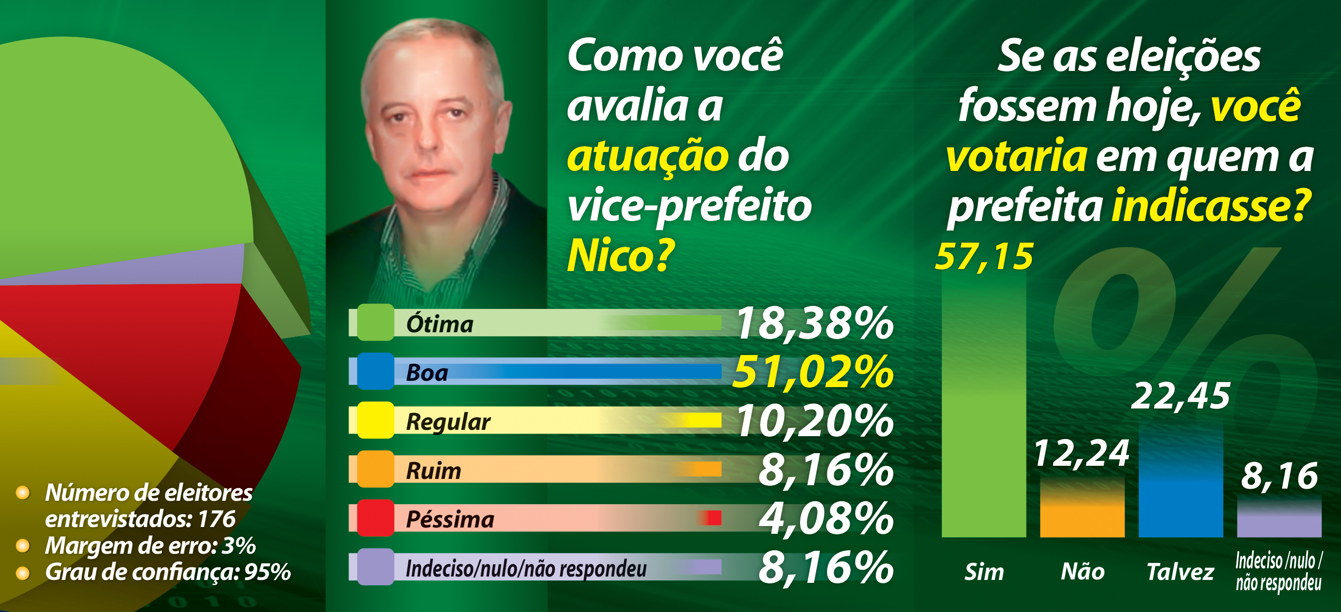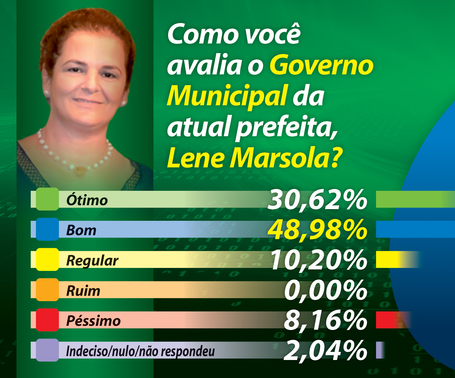 O resultado da pesquisa mostra uma condição amplamente favorável à atual gestora. Além desses índices, também foi quantificado a capacidade de transferibilidade de Lene Marsola, haja vista que ela já é reeleita e, portanto, impedida de participar do próximo pleito municipal. Nesse tópico, 57% dos entrevistados afirmaram que votariam no nome que a alcaidessa indicasse. Em Abril esse índice foi de 56%. Por outro lado, 12% que cravaram que, independentemente do nome escolhido, não votariam. Esse índice anteriormente foi de 11%. Outros 22% optaram pelo “talvez”. Certamente, dentre esses, prevalece a cautela e a decisão dependerá do nome do sucessor escolhido por Marsola. Antes era de 25%. O atual vice-prefeito Nico da Cruz tem avaliação de desempenho pessoal “colado” ao da prefeita Lene e é tido como “ótimo” ou “bom por 69% dos entrevistados